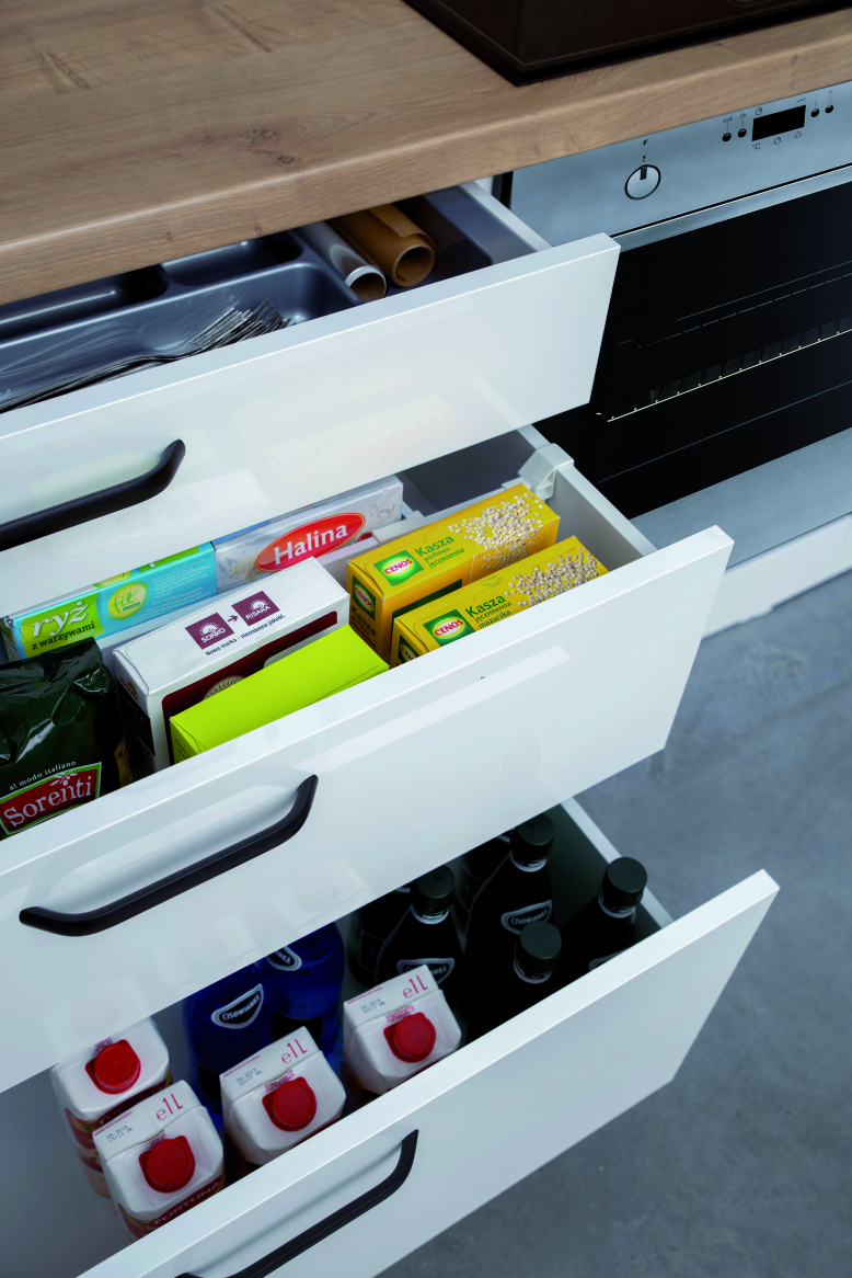 Ergonomiczne rozwiązanie: trójpodział szuflad, czyli trzy wysokości szuflad odpowiednio zaprojektowanych na różne grupy produktowe. Niska na sztućce i drobne akcesoria, jak folia spożywcza i papier do pieczenia. Wyższa na produkty spożywcze w standardowo dostępnych opakowaniach. Najwyższa, nazywana również magazynową, na napoje w kartonach czy zapas wody mineralnej w butelkach. Fot. KAM